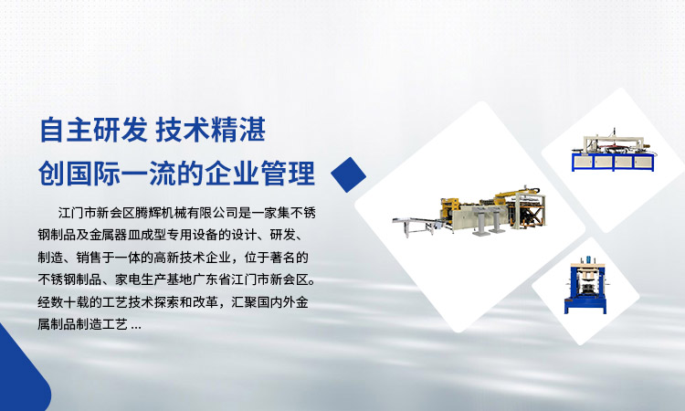 江門市新會(huì)區(qū)騰輝機(jī)械有限公司是一家集不銹鋼制品及金屬器皿成型專用設(shè)備的設(shè)計(jì)、研發(fā)、制造、銷售于一體的高新技術(shù)企業(yè),位于著名的不銹鋼制品、家電生產(chǎn)基地廣東省江門市新會(huì)區(qū)。經(jīng)數(shù)十載的工藝技術(shù)探索和改革,匯聚國(guó)內(nèi)外金屬制品制造工藝。